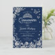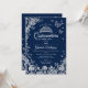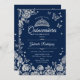 Marinho azul de Quinceanera, convite à celebração. Apresenta fontes de script, borboletas, rosas prateadas e tiara. Perfeito para uma elegante celebração de glam estilo princesa. Personalize com seus próprios detalhes. Impressos convites Zazzle ou modelo de impressão digital instantânea para download.
