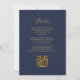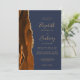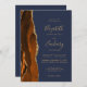 A borda esquerda deste elegante convite de casamento moderno apresenta uma cor de água laranja queimada, aparada com falsa brilho dourado. O texto personalizável combina manuscrito dourado, fontes em copperplate e itálico em um fundo azul marinho escuro. O verso fornece espaço para detalhes do casamento em um fundo azul de marinho sólido, junto com um código QR que os convidados podem digitalizar para visitar seu site e RSVP, o que economiza o custo de imprimir e enviar cartões RSVP separados.
