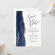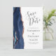 Este elegante e moderno salve a placa de data apresenta um marinho azul de aquarela agate borda aparada com falso rosa dourado. O texto personalizável é uma cinza de carvão em um fundo branco. Substitua facilmente as cinco imagens de exemplo na parte traseira do cartão por suas fotos e adicione um texto breve com informações adicionais (como o URL do seu site).