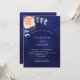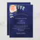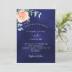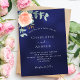 fundo azul marinho, a cor azul é irregular. Decorados com ouro-rosa e folhas de eucalipto cor-de-rosa-esbranquiçada, flores de rosa e cor-de-rosa-esbranquiçada, galhos, verde e borras de ouro. Personalize e adicione seus nomes e detalhes do casamento.