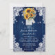 Convite de casamento floral, azul-marinho, russo, com um girassol e dentro de buquê de hálito de bebê em um fundo de madeira rústica, enfeitiçado com rendas florais brancas e luzes de cordas. Design de cartão perfeito para convidar seus hóspedes para sua festa de casamento da Rústica Azul marinho inspirada pelos girassóis.