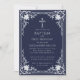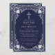 Esse elegante convite para batismo azul e prateado, marinho, com ar vintage, recomendado para um garoto, tem um quadro de folha de alumínio prateado falso ornamentado com decoração elegante de cinzas prateadas barrocas, enfeitadas em fundo azul marinho. Acima do texto, há uma cruz religiosa em folha de prata falsa. Todo texto pode ser personalizado e tem uma cor de cinza de prata semelhante à falso quadro prateado. A safra, falso quadro prateado ornamentado é baseada em um antigo enlace francês de cobrir de livros, de Georges Mercier (1885-1939) - Madame de Maupin por Theophile Gautier, edição 1911, agora no dominio público.