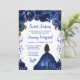 Este elegante e glamouroso e doce convite de 16 anos apresenta uma bela princesa com cabelo castanho e pele escura em um vestido azul marinho de bola. O texto combina o script manuscrito e as fontes sans serif modernas para um aspecto elegante e sofisticado. Os arranjos florais, borboleta e confete criam a mistura perfeita de rústico e chic. Gráficos por www.etsy.com/uk/shop/SunflowerDayLove