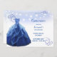 Surpreenda todos os seus hóspedes com este design de vestido azul mágico e marinho para a doce 15 honrarias. Diamond glitz, overlay, e rodando motivos reluzentes no vestido, e mais dois motivos nos cantos superior esquerdo e inferior direito, sob luzes brancas de cordas em fundo branco.