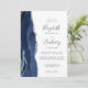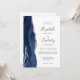 A borda esquerda deste elegante convite de casamento moderno apresenta um marinho azul de aquarela agata bordada com falso brilho prateado. O texto personalizável combina manuscrito, copperplate e fontes itálicas em cinzas de carvão em um fundo branco. O verso fornece espaço para detalhes do casamento em um fundo branco sólido, junto com um código QR que os convidados podem digitalizar para visitar seu site e RSVP, o que economiza o custo de imprimir e enviar cartões RSVP separados.