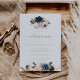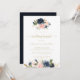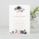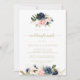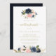Este convite para o brunch de ouro floral com marinho é perfeito para um evento rústico. A design apresenta belas flores azuis escuras pintadas manualmente, azuis, marinhos, rosa, pinceladas, douradas e folhagem verde.