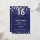 Um convite moderno, na moda e glamouroso para uma doce festa de aniversário 16, 16. Um fundo azul marinho, decorado com estrelas de falso prata. Personalize e adicione seu nome e detalhes da festa. O número 16 é escrito com uma fonte no estilo do balão.