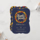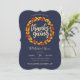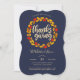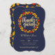 Convide sua família e amigos para o seu banquete de Dia de Ação de Graças com este design de outono. Este cartão apresenta uma Ação de Graças no centro de uma coroa de folhas colorida em queda sobre um fundo do marinho. Na parte traseira desta placa, ela apresenta um padrão de folha amarelo, laranja e vermelho.