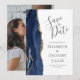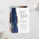 Este elegante e moderno salve a placa de data apresenta um marinho azul de aquarela agata borda cortada com falso brilho dourado. O texto personalizável é uma cinza de carvão em um fundo branco. Substitua facilmente a imagem de amostra no verso por uma foto da futura noiva e noiva.