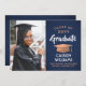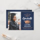Anuncie um segundo grau ou formandos e convide a família e os amigos a celebrarem com convites de festas de cor azul e de cobre de marinho de fotos personalizadas. A imagem e o texto são simples de personalizar e as cores são fáceis de mudar com a ferramenta design Zazzle. Este modelo para download é configurado como um cartão de lançamento combinado e um convite de festas que pode ser personalizado com qualquer detalhe de sua escolha, como nomes de pais, honras especiais, título de grau, citação inspiracional favorita, planos futuros de formando ou novo endereço. O design apresenta um fundo azul-marinho, boné de conselho de morteiro de folha de cobre, caligrafia moderna elegante, tipografia de vintage clássica e uma foto favorita, como uma fotografia de mais velho ou uma imagem da cerimônia de início. Observe que cobre é cor laranja mudada, não é folha metálica. Este cartão de graduação imprimível é uma na moda para anunciar uma celebração especial de dia. Parabéns ao formando!