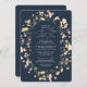 Um convite de casamento com um toque moderno. Um quadro floral de flor silvestre, cor-de-rosa e amarelo pálido, rodeia a informação do casamento sobre um fundo marinho. No verso há espaços de modelo para adicionar detalhes e código QR para seus convidados digitalizarem e RSVP em seu site. Excelente para primavera, verão do outono.