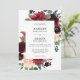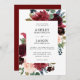 Um design de convite floral de cor d'água pintado lindamente artístico com uma popular combinação de cor vermelha, azul marinho e rosa pincel. O esquema de cores funciona perfeitamente para casamentos no outono ou no inverno, mas também pode ser usado em primavera e verão. Os elementos botânicos incluem rosas, peonias e outras flores mistas em variados tons, juntamente com um verde-luxuoso. A parte de trás do convite é um vermelho pesado. Personalize o modelo de texto com os detalhes do casamento.