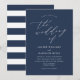 Convide convidados para a celebração do casamento com nossos convites para casamento da Calliografia Minimalista. Os simples e elegantes convites de casamento mostram seus detalhes de casamento em branco, acentuados por belos scripts de caligrafia contra um fundo azul marinho. A parte traseira apresenta faixas marinho azul e branca. A design faz parte da nossa coleção de casamento da Calliografia Minimalista.