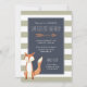 Este convite de festas moderno de tendências apresenta uma raposa de aquarela original. O plano de fundo é um marinho em negrito com cinzas e listras brancas. Perfeito para o convite de aniversário de um menino.