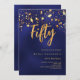 Um convite moderno e na moda para uma 50ª festa de aniversário para ele e para ela. Decorado com estrelas ouros. Fundo azul marinho e a palavra 50 escrita com letras douradas falsas grandes. A cor azul é irregular. Personalize e adicione um nome e detalhes da parte.