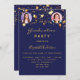 Um cartão de convite para uma festa de formatura de 2025 (ou qualquer ano) para ele e para ela. Um fundo azul marinho decorado com estrelas douradas falsas. Personalize e adicione 2 fotos, um nome e detalhes da festa. Funciona melhor com fotos quadradas. O texto Graduação e o nome são escritos com um script de estilo moderno, escrito à mão. Texto colorido do ouro.