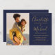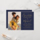 Apresentando seus nomes especiais de fotos e estilo de assinatura, este elegante convite para casamento azul e ouro de marinho pode ser personalizado com suas informações em caracteres quicos. Projetado por Thisnotme©