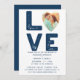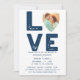 Estes simples convites para o casamento têm uma aparência moderna industrialista com um gráfico ousado que soletra a palavra AMOR em letras marinhos azuis em estilos angustiados com a sua fotografia num coração para o "O". Abaixo do gráfico, seus detalhes de casamento aparecem em uma fonte de estilo de máquina de escrever em azul-marinho de coordenação. O reverso destes convites para a tela plana é um marinho azul. Se você gosta de manter as coisas simples e não quer algo muito florescente, esses convites ao estilo minimalista são perfeitos para divulgar a notícia sobre seu próximo casamento.