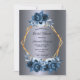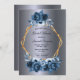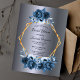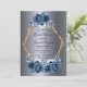 Na frente: Uma tendência de um fundo metálico escuro falso prateado com uma falso estrutura geométrica dourada. Decorados com rosas, flores em azul marinho e tons de azul. Modelos para o nome da noiva e detalhes da festa. O nome é escrito com um script de estilo manuscrito, letras pretas. Volta: fundo metálico prateado escuro falho. Um convite dramático escuro! Perfeito para um casamento no inverno, chá de panela de inverno.