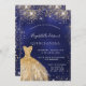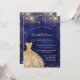 Uma tendência e um convite glamouroso para uma Quinceañera, 15 festa de aniversário. Um fundo azul marinho com poeira brilhante dourada falsa e um vestido. A cor azul é irregular. O nome é escrito com um moderno estilo escrito à mão. Personalize e adicione os detalhes da sua festa.