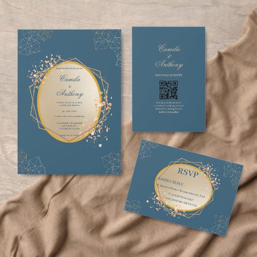 Convite Marinho Dourado Oval Floral Boho Wedding
