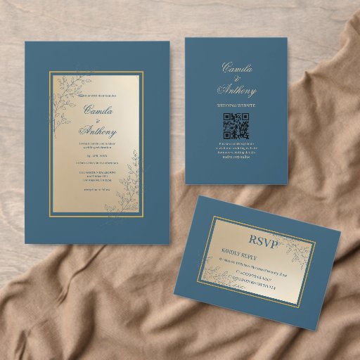 Convite Marinho Dourado Retângulo Floral Boho Casamento
