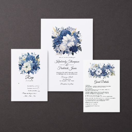 Marinho azul e branco convite de casamento floral com sotaque de ouro personalizável para suas especificidades de evento.