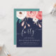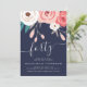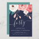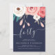 Um bonito convite de aniversário que combina flores com tipografia. Este design apresenta um grande buquê superior em coral, branco e rosa, "quarenta" em letra bonito do estilo caligrafia moderna, sobre um fundo de azul marinho. Os detalhes da festa estão na fonte branca moderna sans serif. O reverso está em verde verde-real com um padrão de treliças sobreposto.