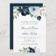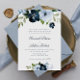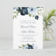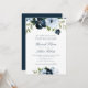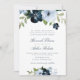 Um design azul de casamento com flores azuis e folhagem. Um design perfeito para o seu casamento de inverno e primavera. Você pode personalizar o texto e os detalhes da cor neste convite de casamento.