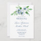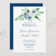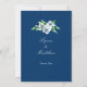 Um Convite Floral para Casamento Elegante e Branco, projetado com sotaque floral branco e azul e texto de Marinho sobre fundo branco. Para personalizar, basta inserir todos os seus detalhes no nosso modelo fácil, substituindo o texto de exemplo.