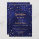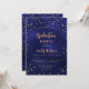 Um cartão de convite glamouroso para uma festa de formatura para ele e para ela. Um fundo azul marinho decorado com estrelas douradas falsas. A cor azul é irregular. Personalize e adicione um nome e detalhes da parte. O texto Graduação e o nome são escritos com um script de estilo moderno, escrito à mão. Texto colorido do ouro. Fundo: fundo azul marinho e estrelas ouros.