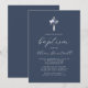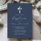 Este elegante convite batismo apresenta um buquê de aquarela de flores azuis e marinhos poeirentas e folhagem prateada numa cruz de folha de alumínio prateada, acima das palavras "junte-se a nós para o batismo do nosso filho" em elegante caligrafia branca e itálico num fundo azul marinho. Personalize-o com o nome no script branco e os detalhes na fonte sans serif. A parte traseira da placa é azul marinho estável. Ideal para o batismo de um menino.