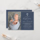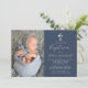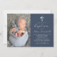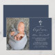 Este elegante convite batismo apresenta um buquê de aquarela de flores azuis e marinhos poeirentas e folhagem prateada numa cruz de folha de papel prateada, acima das palavras "junte-se a nós para o batismo do nosso filho" em elegante caligrafia branca e itálico. Personalize-o com o nome no script branco e os detalhes na fonte sans serif em um fundo azul marinho. Adicione facilmente uma foto vertical do seu filho ao lado esquerdo do convite. A parte traseira da placa é azul marinho estável.