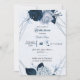 Flores azuis e poeirentas, azuis, marinhos elegantes e algumas folhas bonitas sobre um chá de panela geométrico Os detalhes da brilha são simulados