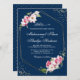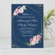 Convide seus convidados com este elegante convite de casamento com lindas flores rosa com falso quadro de hexágono de folha de ouro e 'Bismillah' na caligrafia árabe sobre fundo azul marinho. Basta adicionar os detalhes do seu evento neste modelo fácil de usar para torná-lo um convite de tipo único. Sacudir a placa para mostrar um padrão de pontos azuis e dourados na parte traseira da placa.