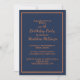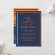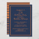 Convite de aniversário estriado de cor laranja e marinho azul.