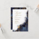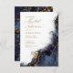 Um fundo abstrato que lembra o mármore em tons de azul marinho veinado com ouro reluzente é o pano de fundo para textos elegantes e layouts modernos de design nos pedaços desta bela suíte de casamento. O convite mostrado aqui apresenta o texto acima mais o texto de script de fluxo opcional de 'Chá de panela' e um modelo para adicionar os detalhes de evento pertinentes. Procure ID644 para ver todas as peças de coordenação neste conjunto.
