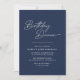 Convites de janto de aniversário de estilo moderno e simplista com "janto de aniversário" em uma fonte de script de estilo manuscrito. Texto branco sobre um fundo azul escuro contrastante.