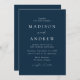Convite de casamento minimalista e moderno com detalhes de seu casamento em letras brancas com acentos de escrita de caligrafia. O fundo do marinho pode ser alterado para uma cor de sua escolha. Projetado para coordenar com a nossa coleção de casamento do Modern Elegance.