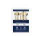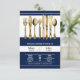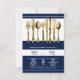Um design chic, elegante e clássico de talheres de ouro falso, colocado sobre um fundo azul escuro com listras brancas