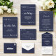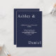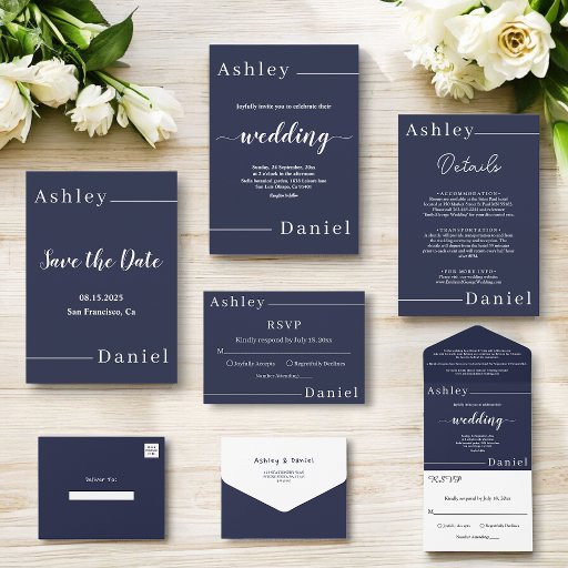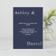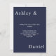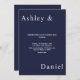 Este elegante convite de casamento azul marinho é perfeito para um casamento moderno. o simples design apresenta uma caligrafia branca elegante num fundo azul.