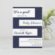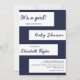 Este elegante convite para chás de fraldas azuis e brancos é perfeito para um casamento moderno. o design apresenta uma caligrafia azul elegante em faixas brancas sobre um fundo azul marinho.
