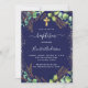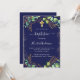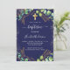 Um fundo azul marinho decorado com verde de eucalipto e folhas de ouro e faíscas de brilho dourado. Uma cruz ouro. Personalize e o nome e a cerimônia da criança. Fundo: fundo azul marinho.
