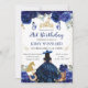 A Elegante cor d'água Black Haired Salon Western princesa em Marinho Blue dress design com flores azuis, borboletas, ferradura, cavalo e bota e bugiganga confetti.