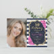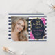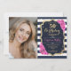 Elegante convite floral feminino para o 50º aniversário com sua foto. Design de cor rosa branca com marinho brilhante com ouro brilhante falso. Apresenta faixas marinho azul e branca, rosas cor-de-rosa, fonte de script e confetti. Perfeito para uma festa de comemoração de na moda adulto. Personalize com seus próprios detalhes. Pode ser personalizado para qualquer idade! Impressos convites Zazzle ou modelo de impressão digital instantânea para download.