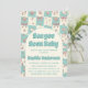 Celebre o seu pequeno(a) que está a caminho com este encantador convite de chá de bebê com tema de praia pastel. Com um fundo de xadrez em azul turquesa suave adornado com delicadas conchas, laços e ilustrações inspiradas no oceano, este design cria uma vibração costeira doce e calmante.