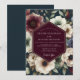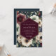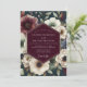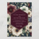 A dramatic and moody floral arrangement sets a romantic tone. This opulent design features lush white anemones, deep maroon dahlias, and delicate blue blossoms against a dark background. The rich, painterly botanicals create an elegant atmosphere perfect for an autumn or winter union.