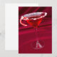 Copo de martini com borda revestida de canas de açúcar trituradas preenchido com coquetel vermelho sobre o vermelho.