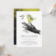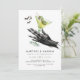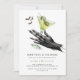 Convites divertidos e assustadores para festas de Halloween com uma ilustração da mão de uma bruxa assustadora segurando um copo de martini. Design moderno com um sotaque verde fino.