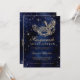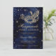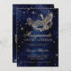 Um doce moderno, chico e glamouroso dezesseis com uma máscara de mascarada com brilho dourado desenhada à mão com faíscas de diamante dourado em um fundo azul-marinho escuro.